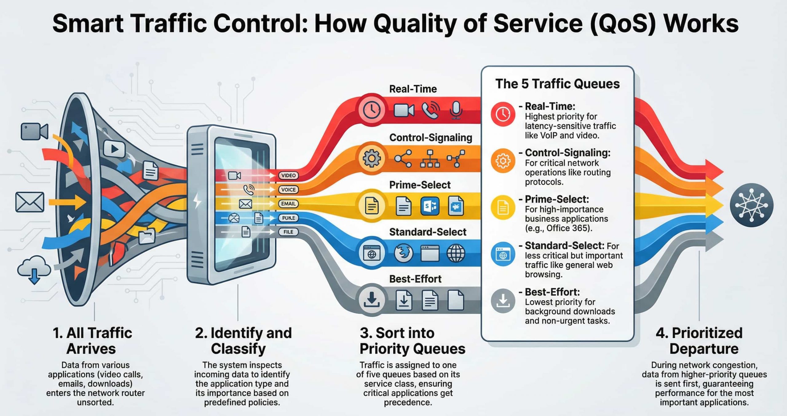 در معماری‌های مدرن، به‌ویژه SD-WAN، شبکه باید بتواند همزمان با انواع ترافیک‌—از تماس‌های بلادرنگ گرفته تا انتقال داده‌های حجیم—به‌صورت هوشمند برخورد کند.